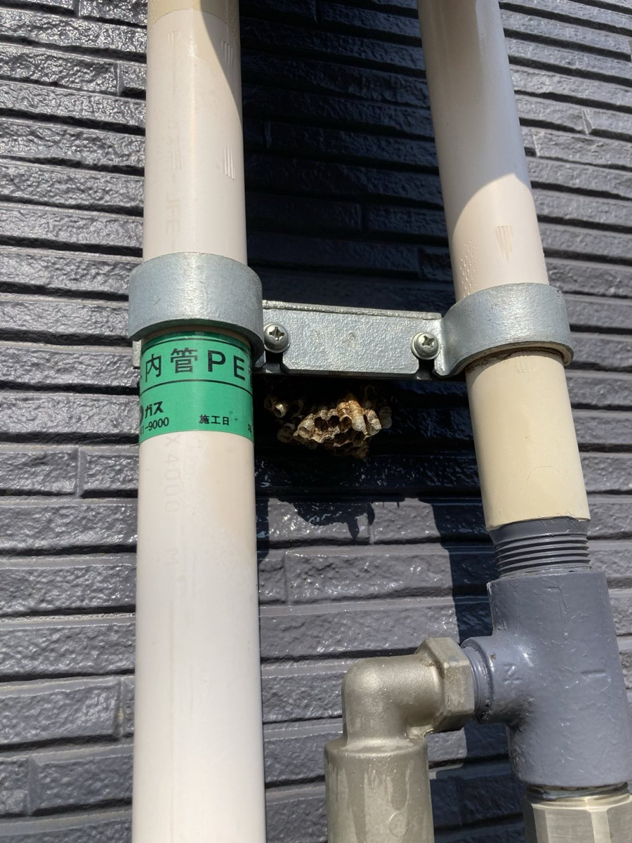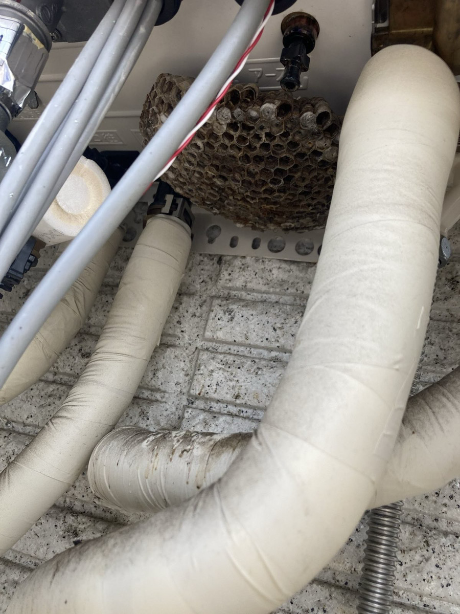 室外機の裏側や配管周辺に営巣。メンテナンス時や掃除の際に発見されることが多く、作業員が刺される事故も発生しています。